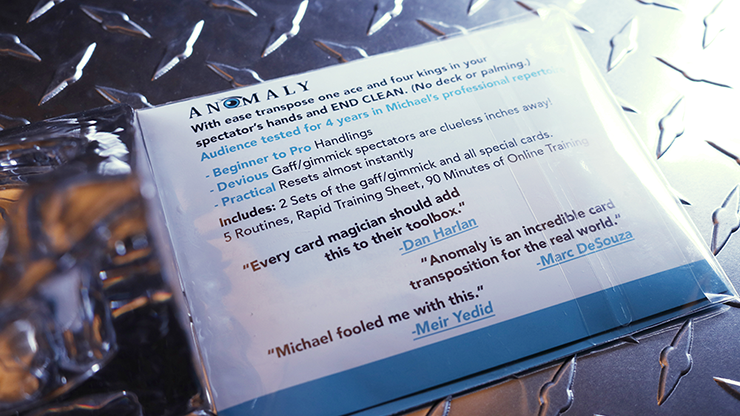 "Anomaly is an incredible card transposition for the real world. It's one thing to have two cards transpose, but Michael ups the ante with a Four for One transposition. Four Kings change places with a single Ace under stringent conditions. Not only that, but you get four additional routines using the same gaffs. Everything provided is top quality and the 90 minute instructional video is terrific. If you add one new card trick to your working repertoire this year, you can't go wrong with Anomaly!"
