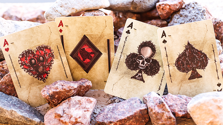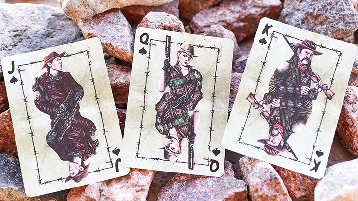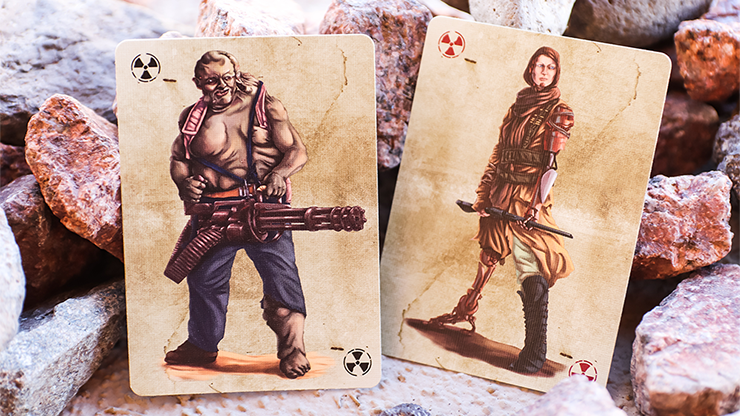 Inspired by works of post-apocalyptic worlds such as Mad Max and Fall Out. The Court characters represent 4 different factions you might find in such a world; Clubs are Wastelanders, Hearts are Enslavers, Spades are Rangers, and Diamonds are Brotherhood of Metal. You will also find 2 mutant Jokers and 4 custom Aces. Top quality handling you can expect from Bicycle playing cards.