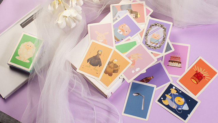 Watercolor style card case design, covered by large area luxuriant purple. And there is a cute sheep printed on the front of it, which is the same design as one of the card faces that can be used to do a cute trick inside. Non-pips design -- we replaced it with various themes of cute paintings. Each group of these paintings may contain two or three cards for you to perform one of the effects. Of course, we filmed a tutorial that is worth 20 dollars, free for you guys