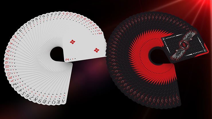 This gunmetal and red holographic foil has to be seen to be believed! This deck was designed for everything from Poker, magic, card collecting, XCM and card throwing! A special stock was created specifically for Falcons by the United States Playing Card Company, makers of Bicycle® Playing Cards. This stock despite feeling like a normal playing card, is a hair thicker allowing this deck to be more durable and hit harder than a standard deck of playing cards.
