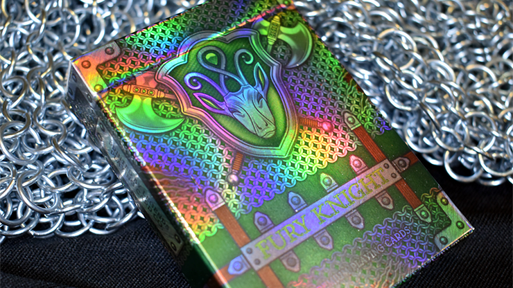 Inspired by knights of the middle ages, the Fury Knight Deck is strong and bold. Printed by Legends Playing Card Co., with their Taiwan printer, the Fury Knight Deck utilizes their exceptional Classic Finish.