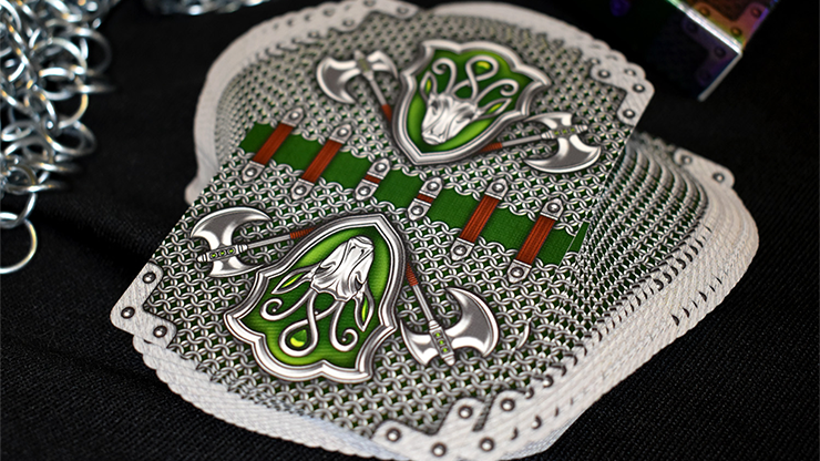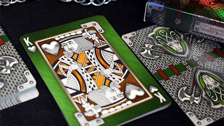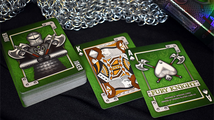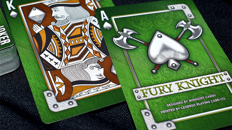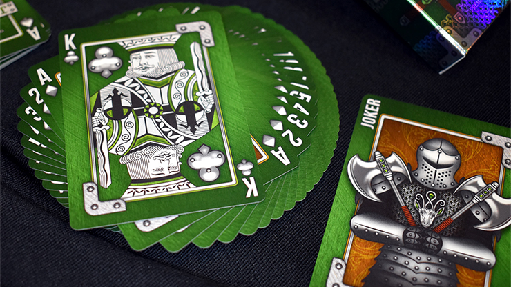 The back card features a chainmail background and a head-to-head layout of the Fury Knight's shield, stag head crest, and a pair of medieval axes. The face cards for the Fury Knight Deck have a metal texture with green full-bleed coloring. The PIPS have a silver metallic look and are inlaid with rivets. The Spades and Clubs have full coverage of green throughout. The Hearts and Diamonds have large center areas with amber coloring. The green and amber color variances help with reading between the suits and overall playability. The semi-custom design utilizes an older court set for the Jacks, Queens, and Kings. The Jokers depict a knight with the stag head chest plate and a pair of medieval axes as his weapons of choice.