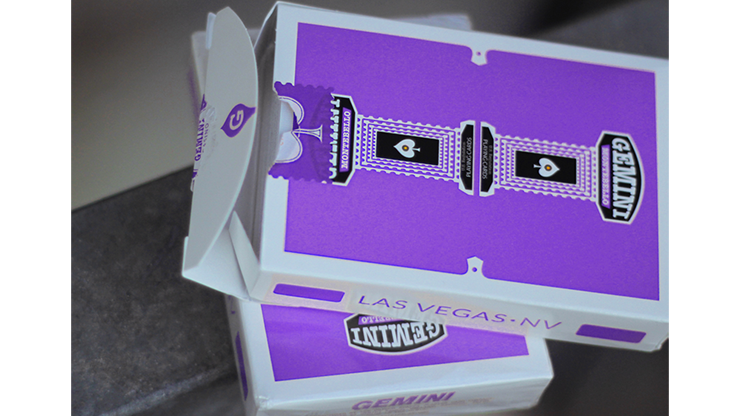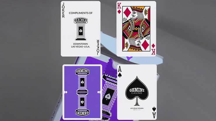 Gemini is a fictional casino deck inspired by treasured classics like Jerry's Nugget and Dunes Casino playing cards. Gemini Casino Purple Playing Cards was made to look like a vintage deck you might find in an old Las Vegas warehouse from the '70s.