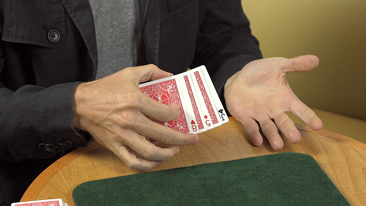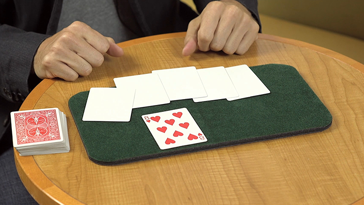 The magician then flips three cards face up and clearly interlaces them between the other three face down cards. As he squares up the packet, the magician explains that there are three magical ways to distinguish the selection from the other five cards.
