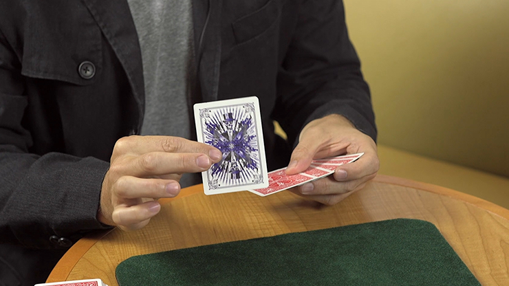The magician then removes the selection and gives it a rub on his sleeve. The card is turned over and is now seen to have a different colored back!