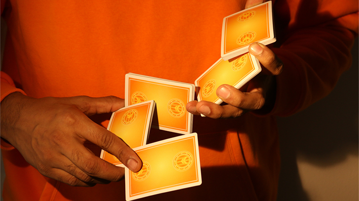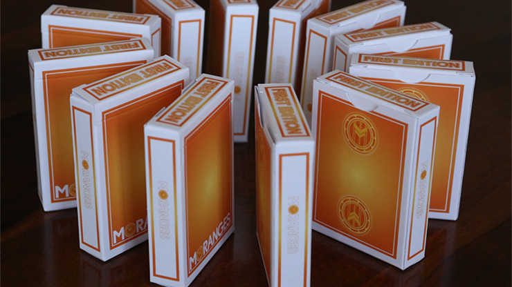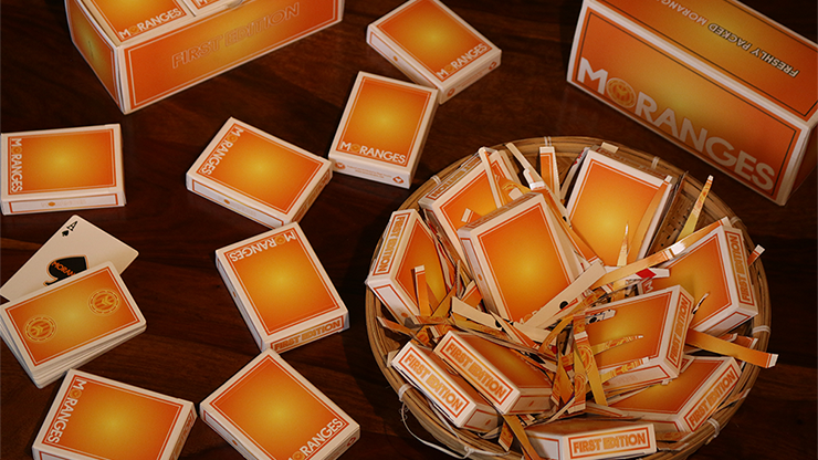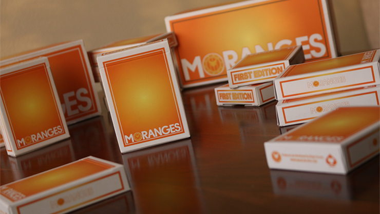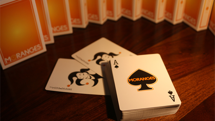Moranges is a playful deck of playing cards, inspired by vintage casino design, and printed with Cartamundi. It's a minimalist mirrored back design, blending colors from mangoes and oranges. With easy-to-read faces, Moranges is a deck that people can use everyday for both cardistry and magic.