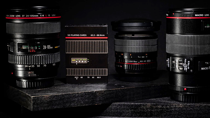 The tuck was designed to mimic the aesthetics of a DSLR camera lens (a.k.a "Glass") while displaying information more related to playing cards. The red ring around the tuck mimics a professional line of lenses, known as Red Rings, which are classified as a higher grade of glass. This deck was created to spark the urge for shooters to get out and shoot.