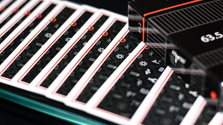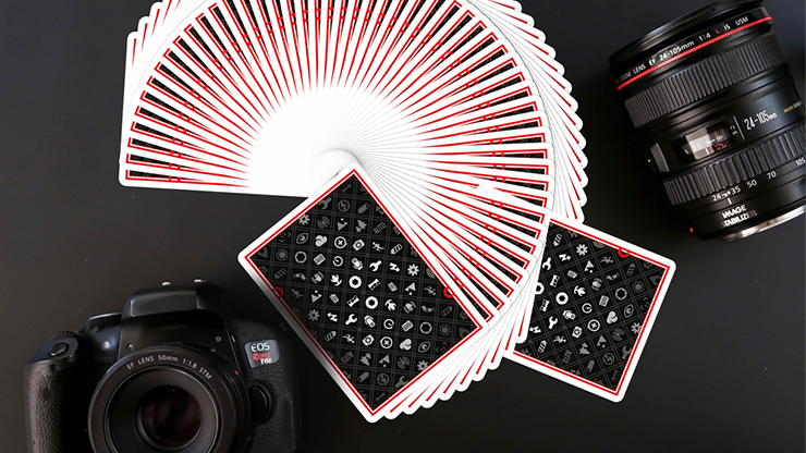 Classic icons like, battery level display, settings, brightness, flash, or self-timer, just to name a few. The red border was created to keep that "red ring" theme throughout the deck. Red metallic ink can be found on the back design and faces of the cards.