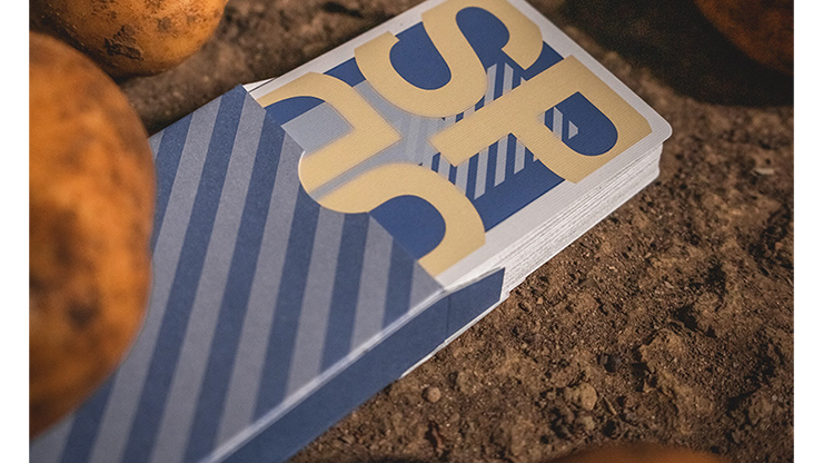 Spud Revision Playing Cards is a bold, unique deck inspired by typography and streetwear. The back features zoomed-in Spud text on top of overlapping rectangles, while the faces expand the diagonally striped design seen on the back.